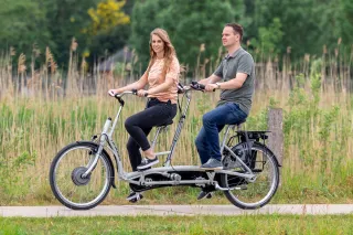 De Van Raam Twinny is een veelzijdige tandem. Prettig is de extra ruimte tussen het zadel van de voorste persoon en het stuur van de achterste.